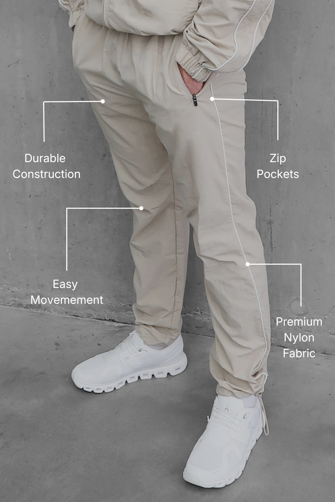 This retro bottom is made from premium nylon fabric. Lightweight, durable, windproof and sweatproof. With zip pockets and toggles on ankle for fastening when using for activewear.